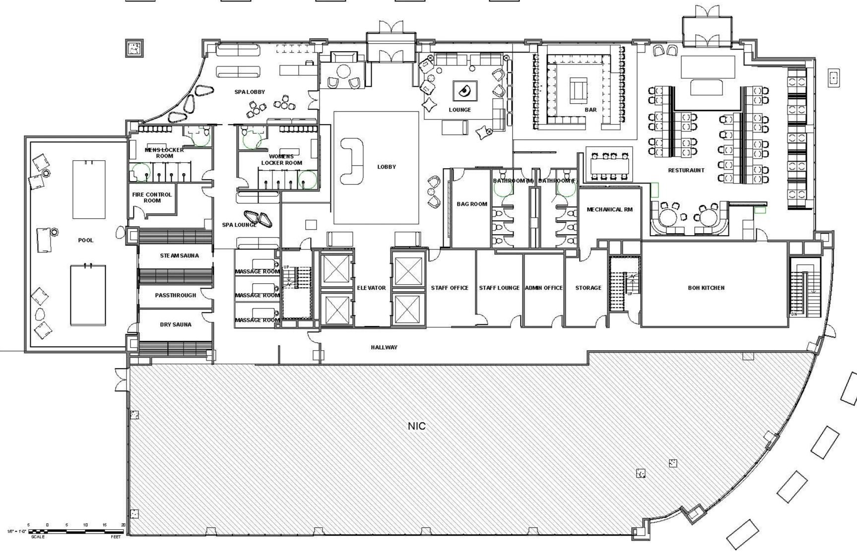 Level 1 welcomes guests with an intuitive reception area inspired by a blend of Scandinavian simplicity and Bohemian warmth. The floor features a restaurant and all-day café, including a Swedish-inspired fika spot, creating inviting social spaces for guests throughout the day. A wellness-focused spa with sauna and hot and cold plunges offers a restorative experience, establishing the floor as both a social and rejuvenating hub of the hospitality experience.